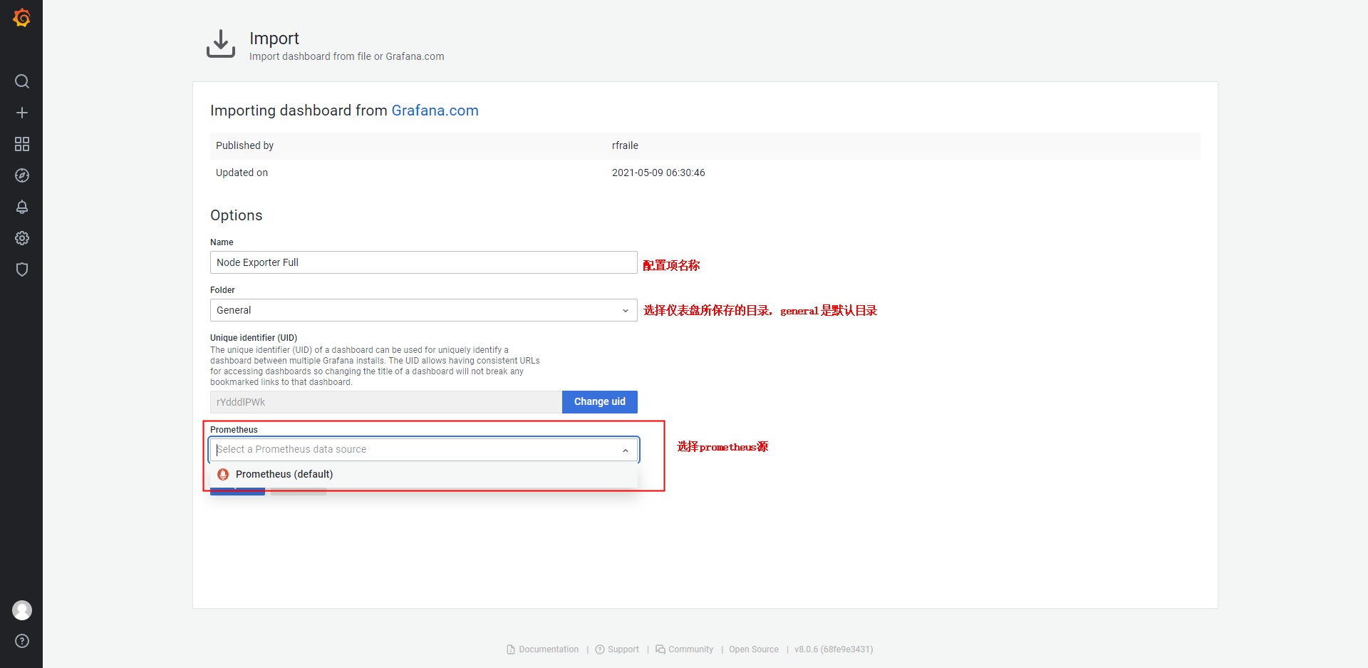 此处特殊说明一下,导入模板的目的本身是为了避免我们重复造轮子,自己去针对每个监控面板写查询prometheus的语句,当然模板本身也是由其他开发者提交的,所以1860并不是我们唯一选择