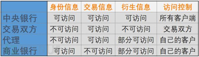 我们国家的数字货币DC/EP在隐私保护方面采用了可控的匿名交易机制,即实现了等同公众使用现金交易的匿名性,又可以有效的打击违法交易活动,表2所示的DC/EP双层结构中各个部分对数据的访问权限,
