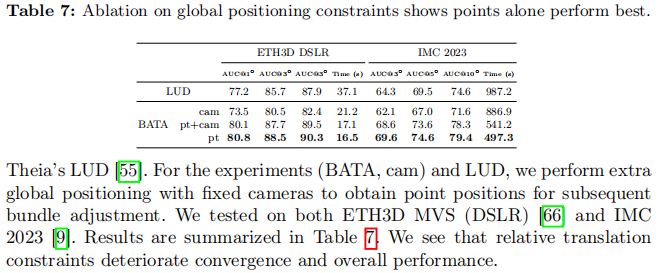 对于BATA, cam+pt实验,我们对两种约束使用了与Theia的LUD[55]实现类似的加权策略。对于BATA, cam和LUD实验,我们执行额外的全局定位(相机固定)以获得点位置用于后续捆集调整。我们在ETH3D MVS(DSLR)[66]和IMC 2023[9]上进行了测试。结果总结在表7中。我们看到相对平移约束会恶化收敛性和整体性能。