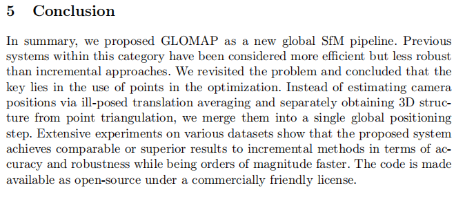 总之,我们提出了GLOMAP作为一个新的全局SfM流程。该类别的先前系统被认为效率更高但不如增量方法鲁棒。我们重新审视了这个问题,得出结论:关键在于在优化中使用点约束。我们没有通过不适定的平移平均来估计相机位置,再通过点三角测量单独获得三维结构,而是将它们合并为一个单一的全局定位步骤。在各种数据集上的广泛实验表明,所提出的系统在精度和鲁棒性方面达到或优于增量方法,同时速度快了几个数量级。该代码以商业友好许可证开源提供。