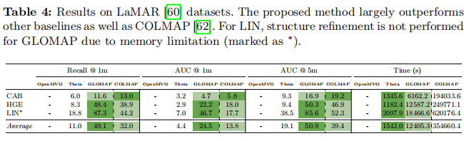 表4:LaMAR[60]数据集上的结果。提出的方法大幅优于其他基线以及COLMAP[62]。对于LIN,由于内存限制(标记为),GLOMAP未执行结构优化。