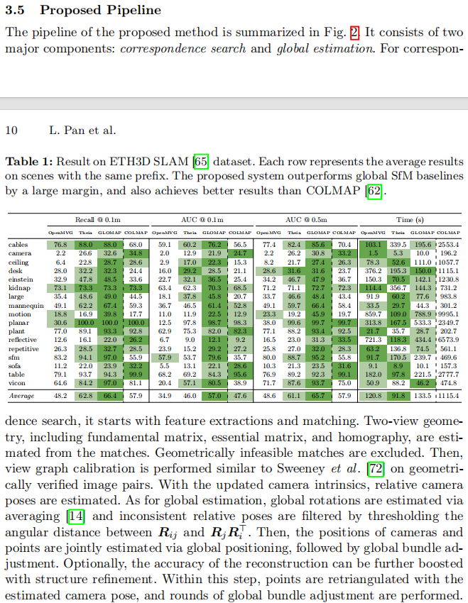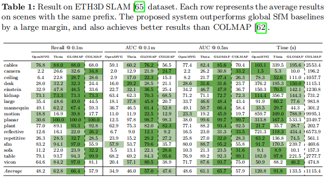 表1:ETH3D SLAM[65]数据集上的结果。每行代表具有相同前缀的场景的平均结果。提出的系统大幅优于全局SfM基线,并且也比COLMAP[62]取得更好结果。