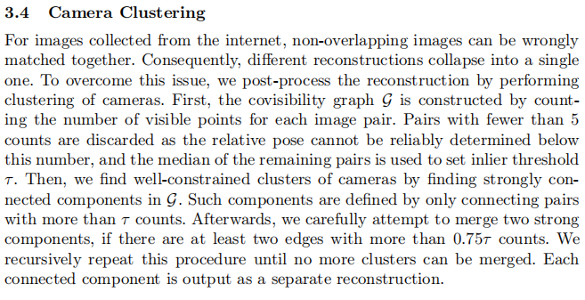 对于来自互联网的图像,非重叠的图像可能会被错误地匹配在一起。因此,不同的重建会坍缩成一个。为了克服这个问题,我们通过对相机进行聚类(clustering)来进行后处理重建。首先,通过计算每对图像间可见点的数量来构建共视图(covisibility graph)GGG。计数少于5的点对将被丢弃,因为低于这个数量无法可靠确定相对位姿,并使用剩余点对的中位数来设置内点阈值 τ\tauτ。然后,我们通过在 GGG 中寻找强连通分量(strongly connected components)来找到约束良好的相机簇。这样的分量定义为仅连接计数大于 τ\tauτ 的点对。之后,我们谨慎尝试合并两个强分量,如果它们之间至少有两条边计数大于0.75τ\tauτ。我们递归地重复此过程,直到没有更多的簇可以合并。每个连通分量作为一个独立的重建输出。