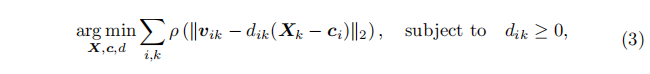 其中 vik 是从相机 ci 观察点 Xk 的全局旋转后的相机光线(globally rotated camera ray),而 dik 是一个归一化因子。我们使用Huber[33]作为鲁棒函数 ρ,并使用来自Ceres[3]的Levenberg-Marquardt[40]作为优化器。所有点和相机变量通过在范围 [−1,1]内的均匀随机分布进行初始化,而归一化因子则初始化为 dik=1。我们将涉及未知内在参数相机的项的权重降低2倍,以减少它们的影响。