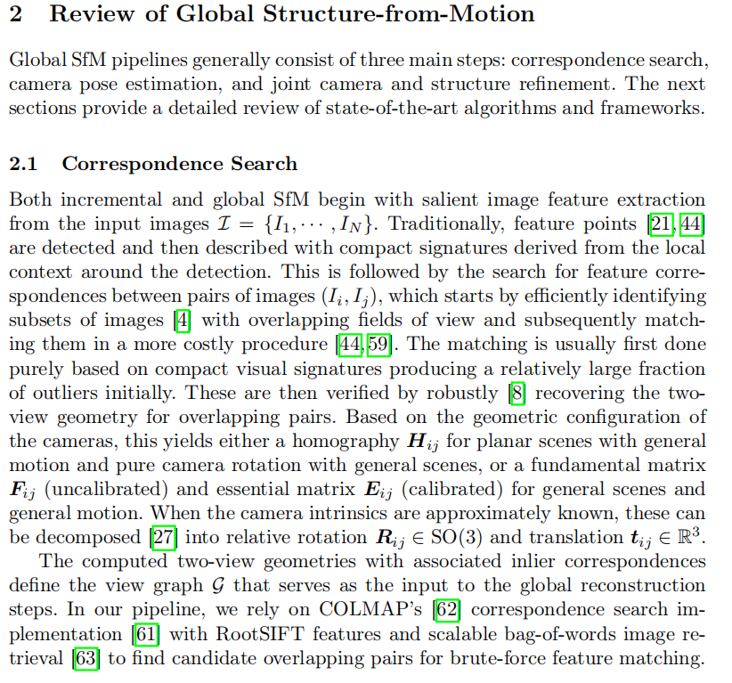 全局SfM流程通常包含三个主要步骤:对应搜索、相机位姿估计以及相机与结构联合优化。接下来几节详细回顾了最先进的算法和框架。