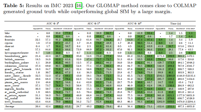 表5:IMC 2023[16]上的结果。我们的GLOMAP方法接近COLMAP生成的地面真值,同时大幅优于全局SfM。