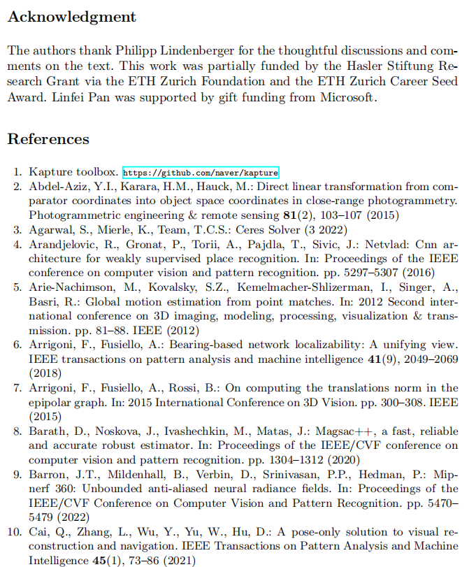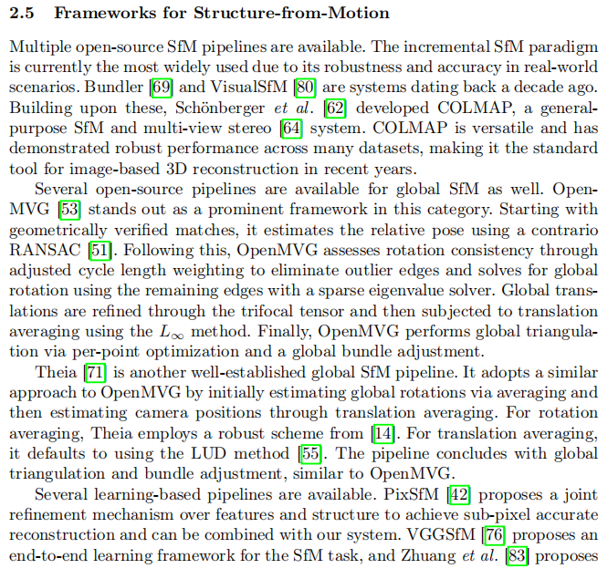 - 基于学习的流程:有几个基于学习的流程可用。PixSfM[42]提出了一种联合优化特征和结构的机制,以实现亚像素级精确重建,并且可以与我们的系统结合使用。VGG SfM[76]提出了一个用于SfM任务的端到端学习框架,而Zhuang等人[83]提出直接在像素级对应点上操作以回归相机位置。然而,这两种方法仅限于处理数十张图像。