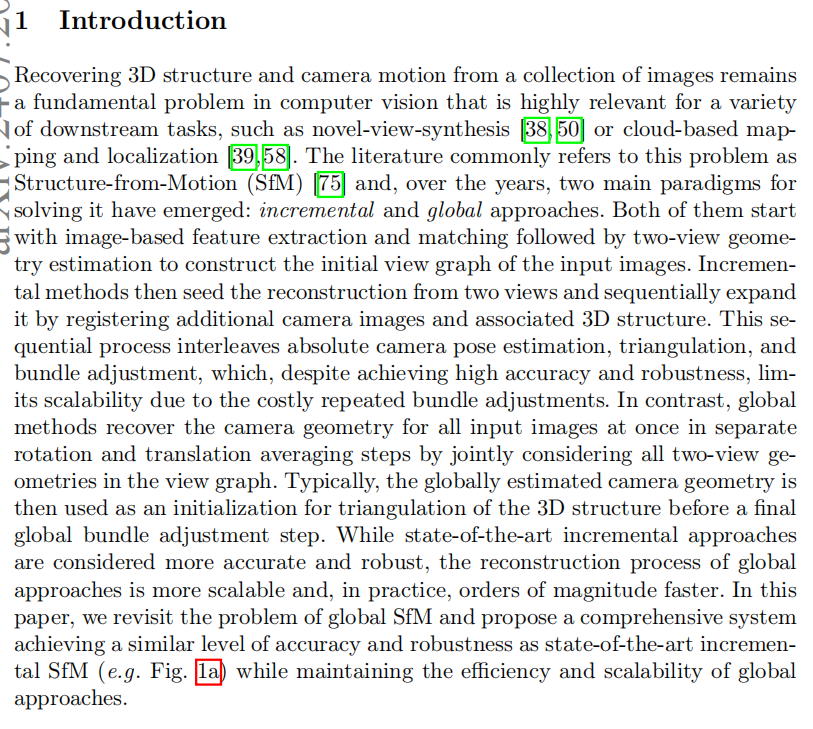 在本文中,我们重新审视全局SfM问题,提出了一个全面的系统,在达到与最先进增量式SfM(例如图1a)相当的精度和鲁棒性的同时,保持了全局方法的效率和可扩展性。