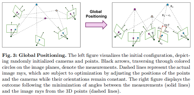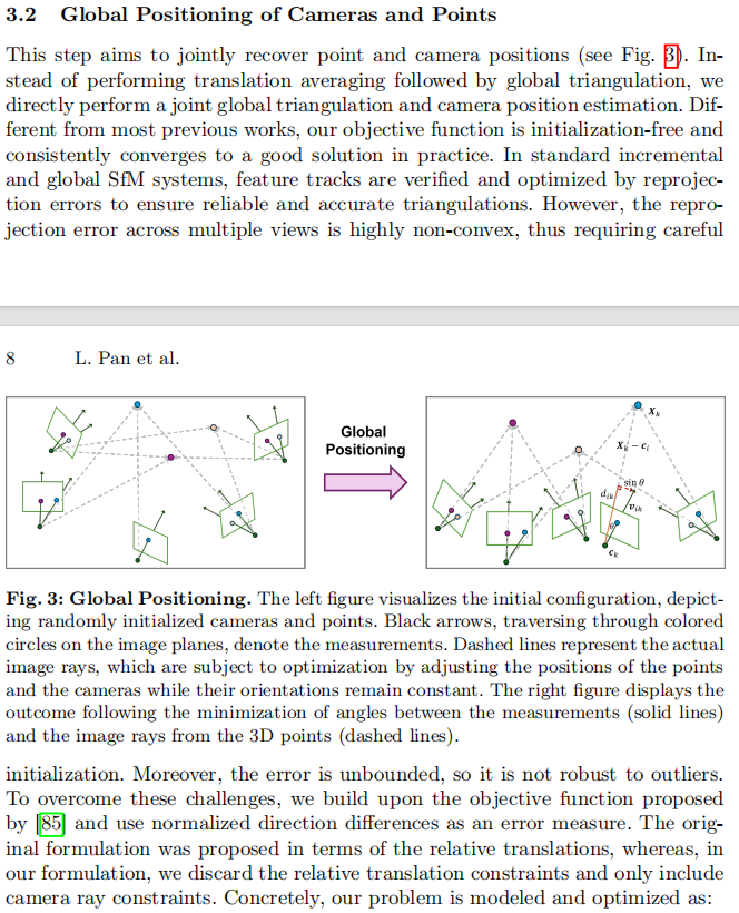 此步骤旨在联合恢复点和相机位置(见图3)。我们不执行平移平均后再进行全局三角测量,而是直接执行联合全局三角测量和相机位置估计。与大多数先前工作不同,我们的目标函数无需初始化,并且在实践中始终收敛到良好的解。在标准的增量式和全局式SfM系统中,特征轨迹通过重投影误差进行验证和优化,以确保可靠和精确的三角测量。然而,多视图的重投影误差是高度非凸的,因此需要仔细的初始化。此外,该误差是无界的,因此对外点不鲁棒。为了克服这些挑战,我们基于[85]提出的目标函数,并使用归一化的方向差异(normalized direction differences)作为误差度量。原始公式是针对相对平移提出的,而在我们的公式中,我们丢弃了相对平移约束,仅包含相机光线约束(camera ray constraints)。具体来说,我们的问题被建模并优化为: