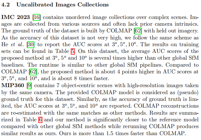 - IMC 2023[16]:包含复杂场景上的无序图像集合。图像来源多样,通常缺乏先验相机内在参数。该数据集的地面真值由COLMAP[62]构建(使用保留图像)。由于该数据集的准确性不是很高,我们遵循He等人[30]的方案,在 3∘,5∘,10∘ 阈值下报告AUC分数。训练集上的结果见表5。在此数据集上,所提方法在 3∘,5∘和 10∘ 的平均AUC分数比其他全局SfM基线高出数倍。运行时间与其他全局SfM流程相似。与COLMAP[62]相比,所提方法在 3∘,5∘和 10∘ 的AUC分数高出约4分,并且快约8倍。