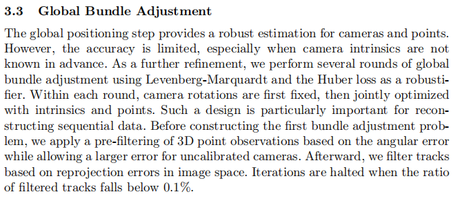 全局定位步骤为相机和点提供了鲁棒的估计。然而,精度有限,尤其是在相机内在参数事先未知的情况下。作为进一步的优化,我们使用Levenberg-Marquardt和Huber损失作为鲁棒函数执行几轮全局捆集调整。在每一轮中,相机旋转首先固定,然后与内在参数和点一起进行联合优化。这种设计对于重建序列数据尤为重要。在构建第一个捆集调整问题之前,我们基于角度误差对3D点观测进行预过滤,同时对未标定相机允许更大的误差。之后,我们基于图像空间中的重投影误差过滤轨迹。当过滤轨迹的比率低于0.1%时,迭代停止。