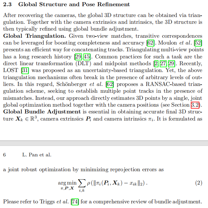 全局三角测量。给定两视图匹配,可以利用传递性对应点来提高完整性和准确性[62]。Moulon等人[52]提出了一种高效连接轨迹(tracks)的方法。多视图点的三角测量有着悠久的研究历史[29,45]。此类任务的常见做法是直接线性变换(DLT)和中点法[2,27,29]。最近,LOST[31]被提出作为一种基于不确定性的三角测量方法。然而,上述三角测量机制在面对任意水平的外点时常常失效。在这方面,Schonberger等人[62]提出了一种基于RANSAC的三角测量方案,旨在存在误匹配的情况下建立多点轨迹。相反,我们的方法通过单一的、与相机位置联合的全局优化方法直接估计三维点(见第3.2节)。