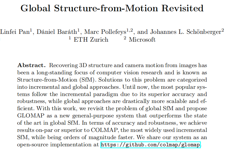从图像中恢复三维结构和相机运动一直是计算机视觉研究的长期焦点,被称为运动恢复结构(Structure-from-Motion, SfM)。该问题的解决方案分为增量式(incremental)和全局式(global)两种方法。迄今为止,由于其卓越的精度和鲁棒性,最流行的系统遵循增量范式,而全局方法则在可扩展性和效率上具有显著优势。本文中,我们重新审视全局SfM问题,提出了GLOMAP作为一个新的通用系统,其性能优于最先进的全局SfM方法。在精度和鲁棒性方面,我们取得了与最广泛使用的增量式SfM系统COLMAP相当或更优的结果,同时速度快了几个数量级。我们在 https://github.com/colmap/glomap 上开源分享了我们的系统实现。
