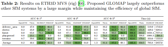 表2:ETH3D MVS(rig)[66]上的结果。提出的GLOMAP大幅优于其他SfM系统,同时保持了全局SfM的效率。
