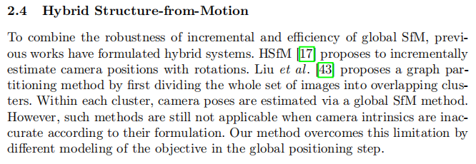 为了结合增量式SfM的鲁棒性和全局式SfM的效率,先前的工作制定了混合系统。HSfM[17]提出增量式地估计相机位置(伴随旋转)。Liu等人[43]提出了一种图划分方法,首先将整个图像集划分为重叠的簇(clusters)。在每个簇内,通过全局SfM方法估计相机位姿。然而,根据其公式,当相机内在参数不准确时,此类方法仍然不适用。我们的方法通过对全局定位步骤中目标函数的不同建模克服了这一限制。