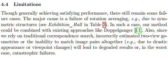 虽然通常能取得令人满意的性能,但仍然存在一些失败案例。主要原因在于旋转平均的失败,例如由于对称结构(见表3中的 Exhibition_Hall)。在这种情况下,我们的方法可以与现有方法(如Doppelganger[11])结合使用。此外,由于我们依赖于传统的对应搜索,错误估计的两视图几何或完全无法匹配图像对(例如由于剧烈的外观或视角变化)将导致结果质量下降,或在最坏情况下导致灾难性失败。