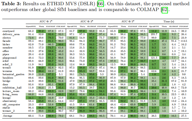 表3:ETH3D MVS(DSLR)[66]上的结果。在此数据集上,提出的方法优于其他全局SfM基线,并与COLMAP[62]相当。