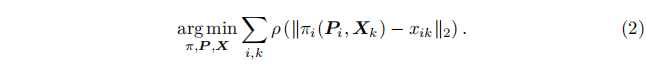 全局捆集调整对于获得精确的最终三维结构 Xk∈R3、相机外参 Pi 和相机内在参数 πi 至关重要。它被表述为一个联合鲁棒优化问题,通过最小化重投影误差实现:
