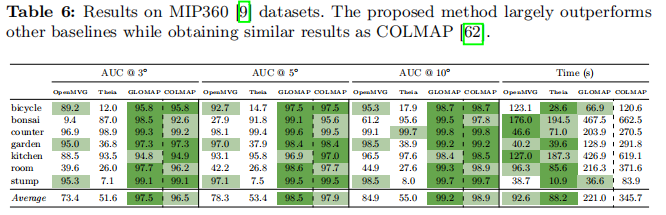 - MIP360[9]:包含7个以物体为中心的场景,由同一相机拍摄的高分辨率图像。提供的COLMAP模型被视为该数据集的(伪)地面真值。类似地,由于地面真值精度有限,报告了在3°,5°,和10°下的AUC分数。COLMAP重建使用与其他方法相同的匹配重新估计。结果总结在表6中,我们的方法比其它全局SfM方法显著更接近参考模型,而重新运行COLMAP产生的结果与我们相似。我们比COLMAP快1.5倍以上。