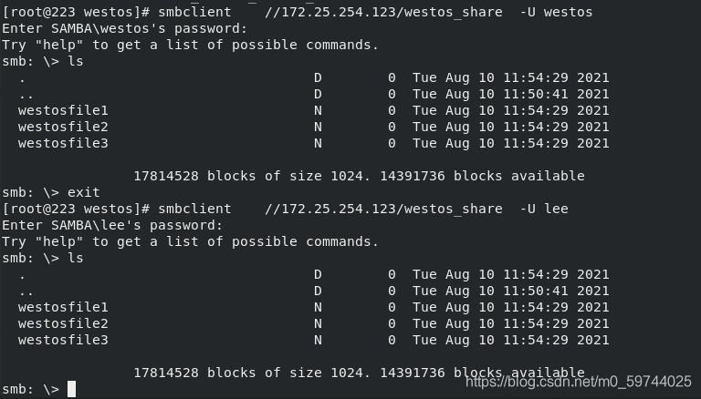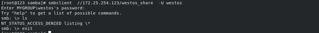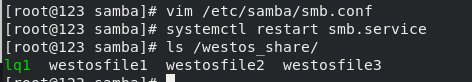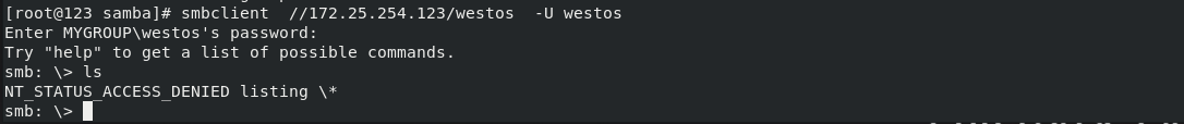 smbclient //172.25.254.123/westos_share -U westos 再次进入就可以查看westos_share中创建的文件