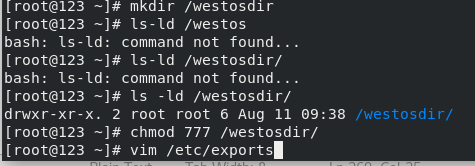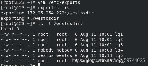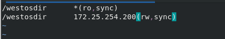 /westosdir *(ro,sync) ##sync(没有wq保存不共享,)async(在客户端编写文件即使写了wq没保存也共享,实施同步)