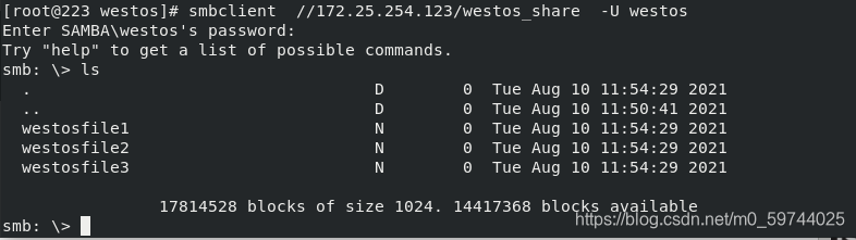 smbclient //172.25.254.123/westos -U westos ##查看smb中westos用户共享资源中的westos内容
