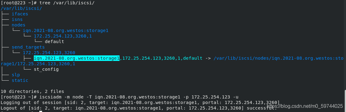 iscsiadm -m node -T iqn.2021-08.org.westos:storage1 -p 172.25.254.123 -u ##-u表示退出登陆