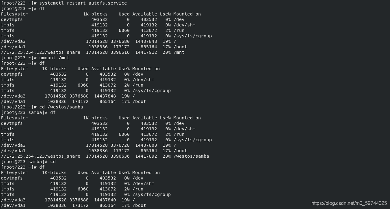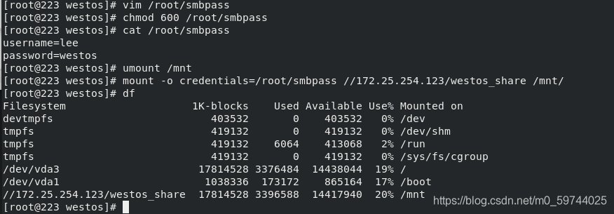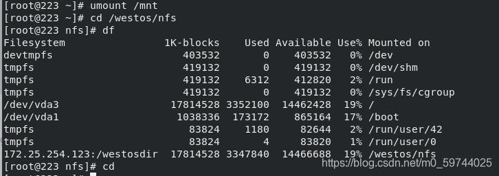 nfs -rw 172.25.254.123:/westosdir ##最终挂载路径 挂载参数 nfs服务器上共享出来的资源