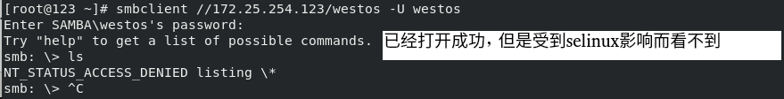 smbclient //172.25.254.123/westos -U westos ##可以进入但是查看不到家目录