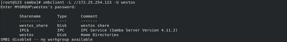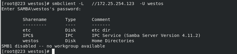 smbclient -L //172.25.254.123 -U westos ##查看smb中westos用户共享资源
