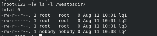 服务器 ls -l /westosdir/ 可以看到当客户端挂载共享本地目录后,使用到的用户身份是服务器上的nobody