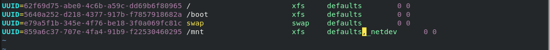 UUID=859a6c37-707e-4fa4-91b9-f22530460295 /mnt xfs defaults,_netdev 0 0