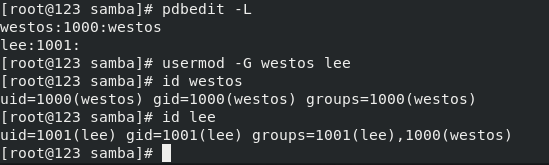 如果设定为 valid users = @|+westos 表示指定westos组以及组成员都可以连接这个目录,用@或者+均可,且保证lee用户也是samba用户