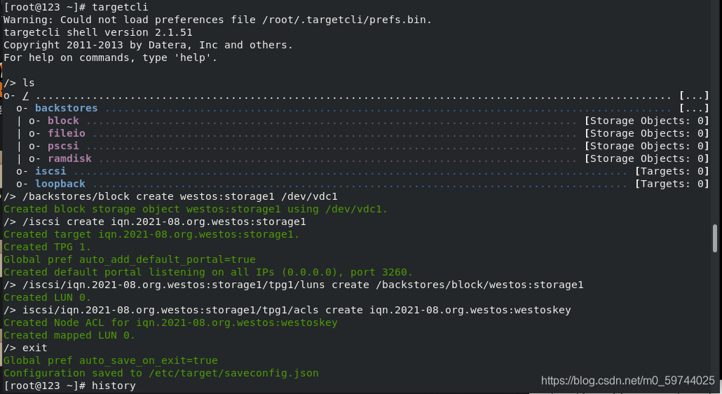 /> iscsi/iqn.2021-08.org.westos:storage1/tpg1/acls create iqn.2021-08.org.westos:westoskey ##未共享设备设定访问key , key本是加密字符,实验方便用westoskey