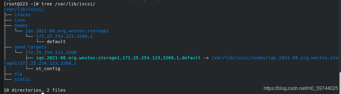 tree /var/lib/iscsi/ ##在客户端读取道德服务器的所有数据存放目录