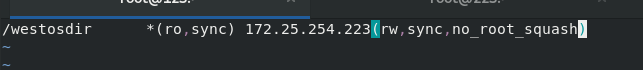 /westosdir *(ro,sync) 172.25.254.223(rw,sync,no_root_squash) ##当客户端使用超级用户进行nfs资源挂载后沿用自己root身份到服务器中