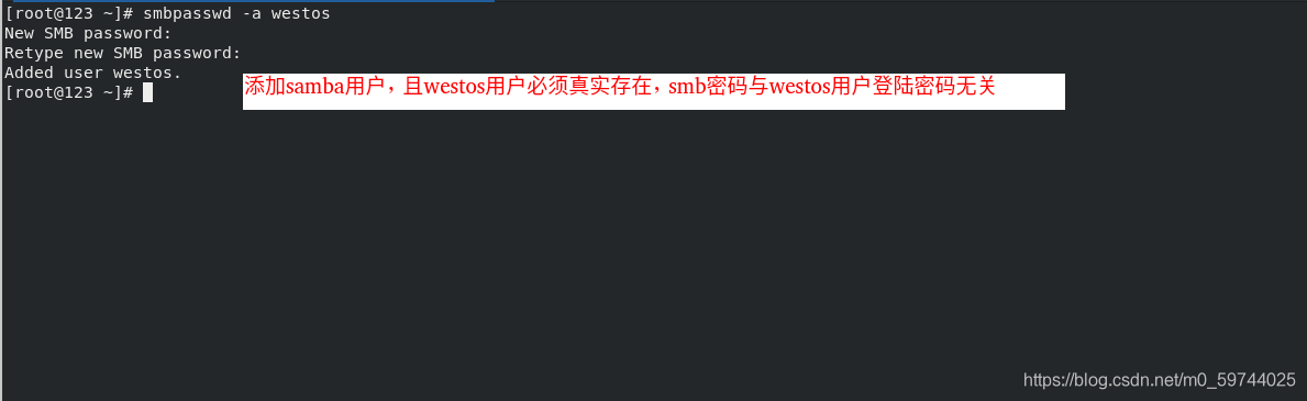 smbpasswd -a westos ##用户westos存在,并且smb密码是独立的密码和westos登录系统密码无关