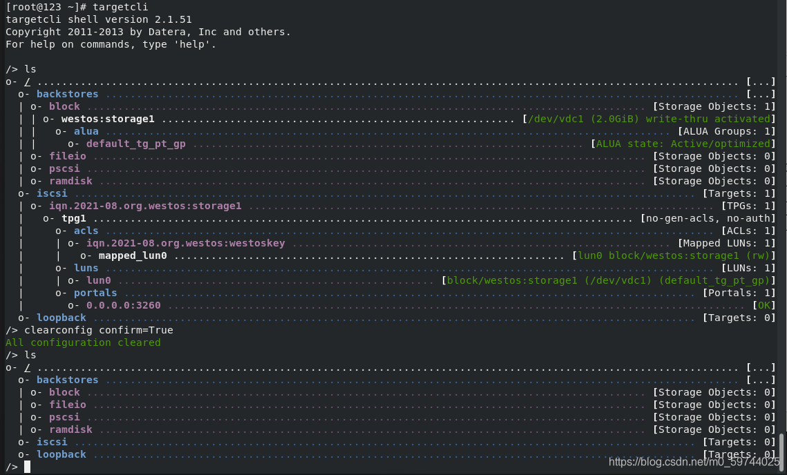 输入clearconfig confirm=True ##清空服务器中iscsi的共享数据
