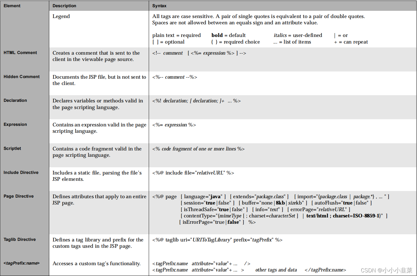 JSP语法小知识点 jsp语法小知识点,Element,HTML Comment,Hidden Comment,Declaration,Expression,Scriptlet,Include Directive,Page Directive,Taglib Directive,,,,,,,,Implicit Objects。