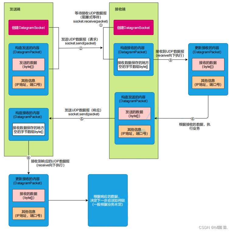 java中使用UDP协议通信,主要基于 DatagramSocket 类来创建数据报套接字,并使用 DatagramPacket 作为发送或接收的UDP数据报。对于一次发送及接收UDP数据报的流程如下: