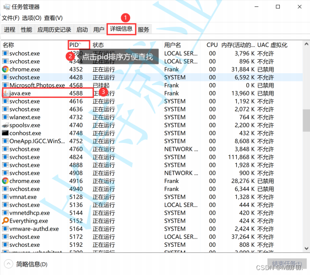 - 在任务管理器中,通过pid查找进程