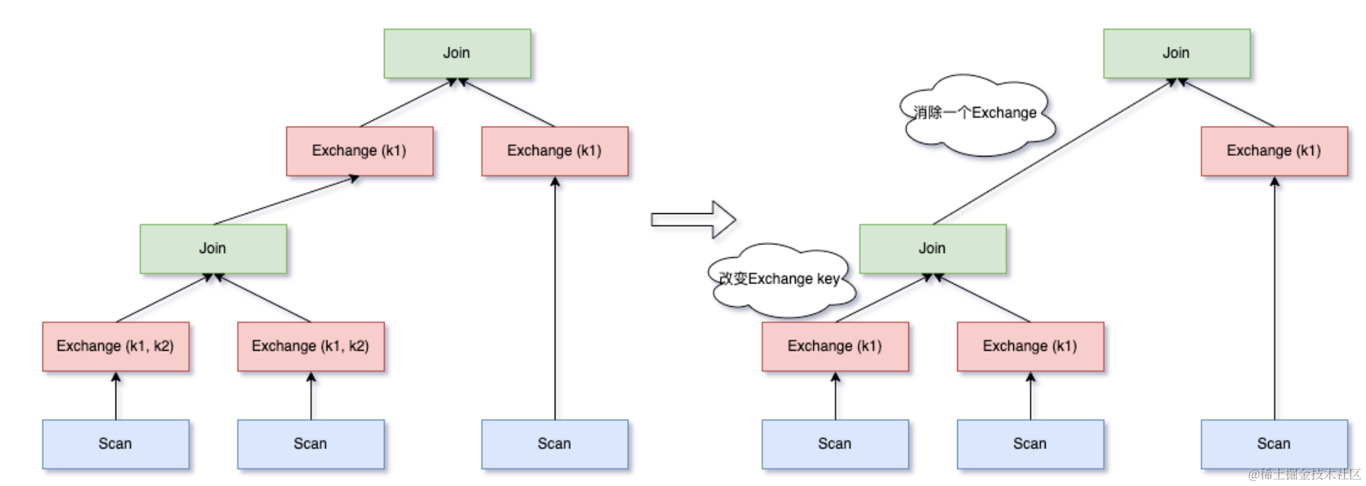如下 SQL 所示,Join 左侧需要 Exchange(id11) 来使 Join key 满足分布,而左表子查询中因为 Group-by,需要通过 Exchange(id1, id2) 来使数据满足分布,此时可以使 Exchange(id11) 来替换 Exchange(id1, id2),节省掉 Join 左侧的 Exchange。