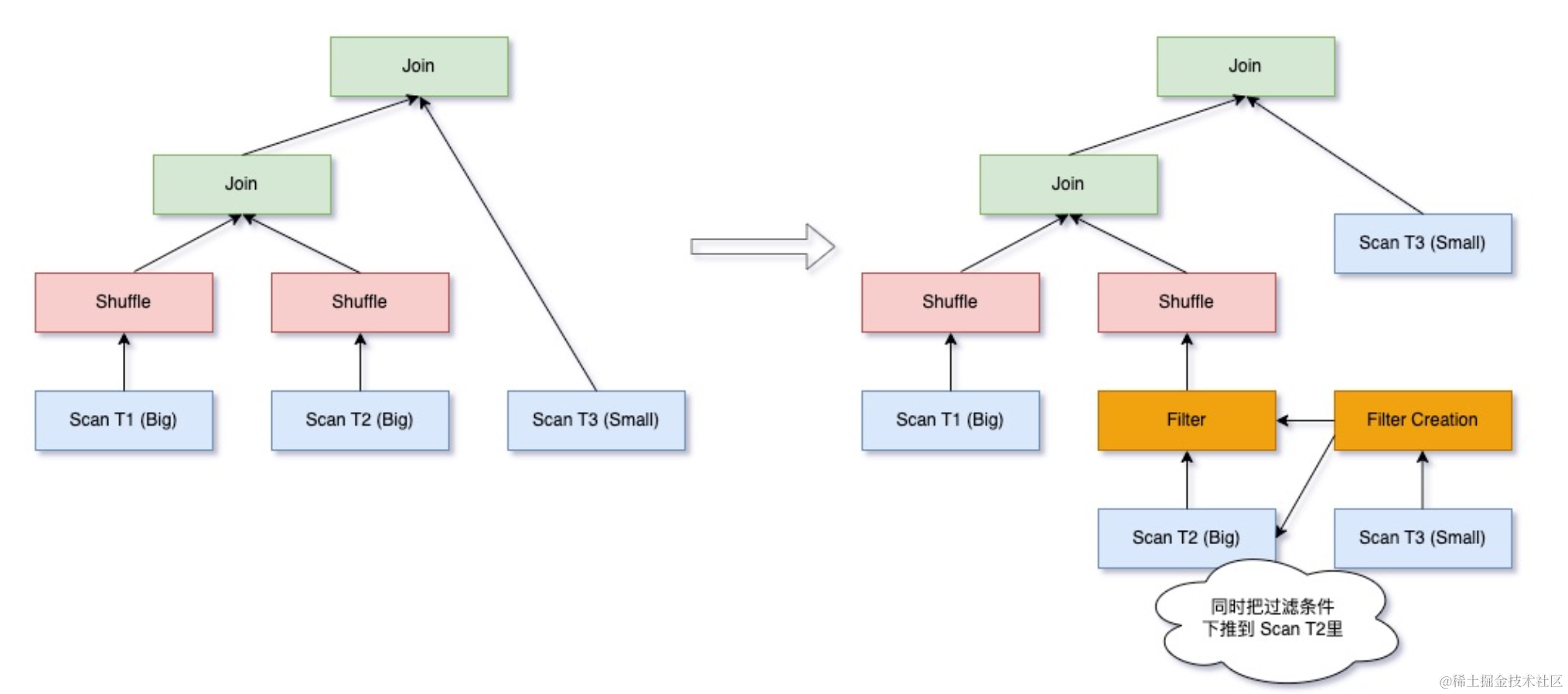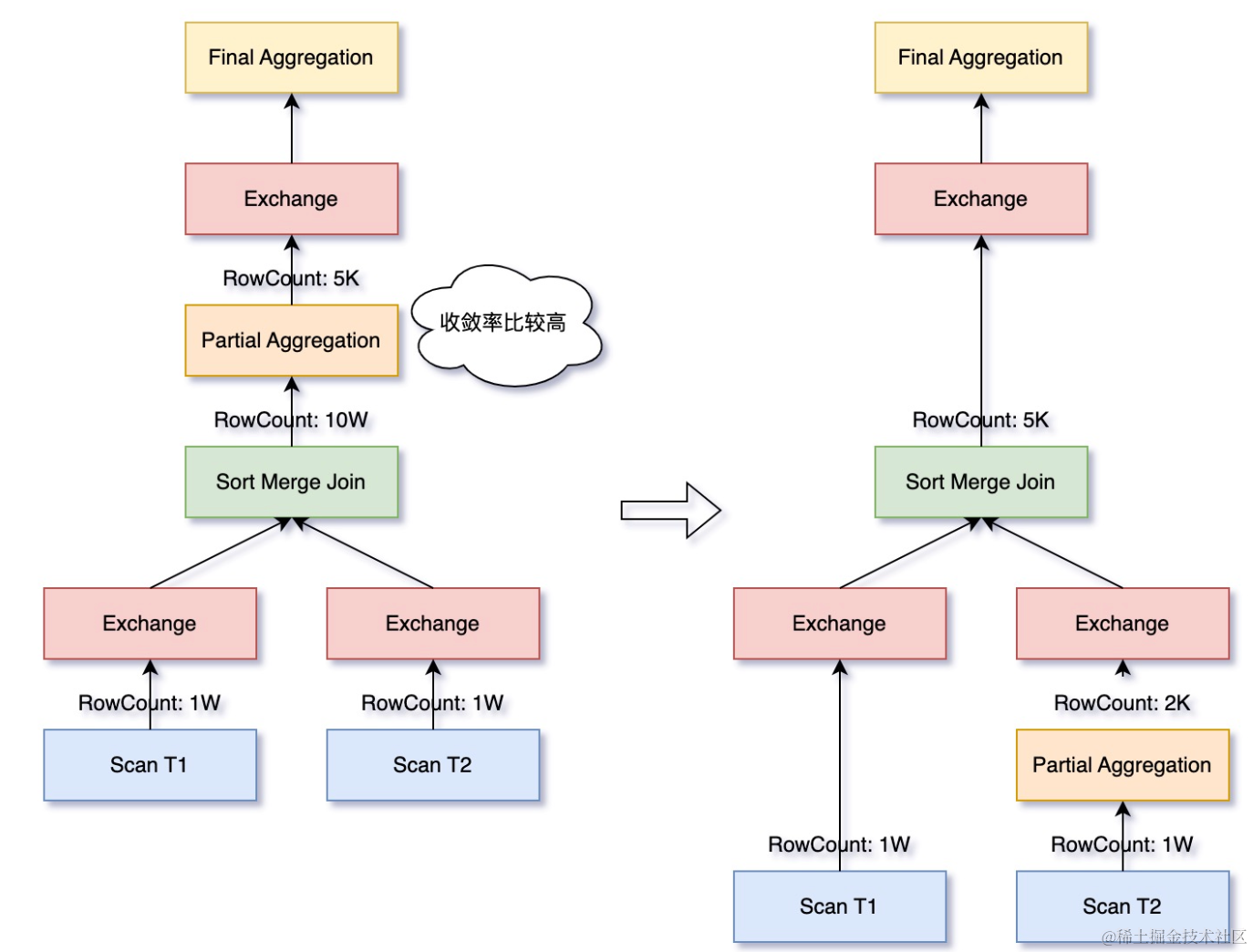 Join+Agg是 SQL 中常见的组合,并且开销往往较大。对于Join 之后再做 Aggregate 的情况,如果 Aggregate 的聚合率比较高,并且 Join 时需要先进行 Shuffle,可以先做聚合,减少参与 Shuffle 的数据量。