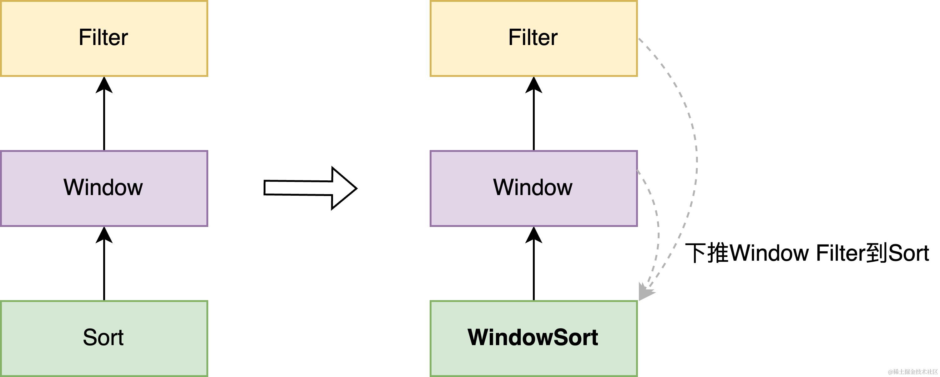 由于 Query 67 中 window 计算后紧跟着过滤条件: rk <= 100, 对于这类的查询 pattern, 其实完全可以将 rk <= 100下推到 Sort,在 Sort 计算中完成 TopK 计算,这样能够大幅减少 Sort 的计算量以及 Window 的输入数据量。