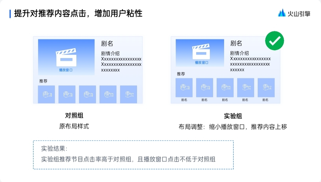 比如将主播放窗口缩小,推荐内容上移。针对优化后 UI 和原 UI 开启 A/B 实验,发现优化后 UI 推荐节目点击率高于原 UI,且播放窗口点击不低于原 UI,达到了该实验的效果。