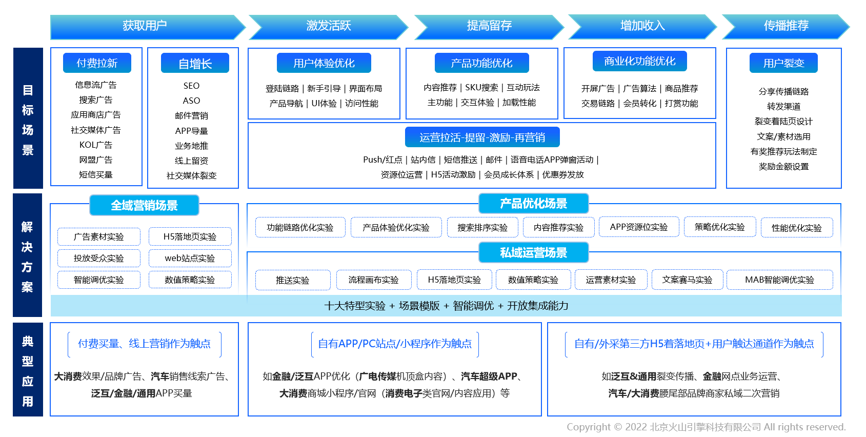 在用户拉新环节,企业可以通过广告素材实验、落地页实验、投放受众实验及智能调优等实验实现产品的推广优化。在后续的用户激活、用户留存活跃环节,企业可以通过 A/B 测试帮助产品优化,开启产品体验优化实验、搜索排序实验等,实现用户体验、产品功能的优化,提升用户提留并实现沉寂用户激活。
