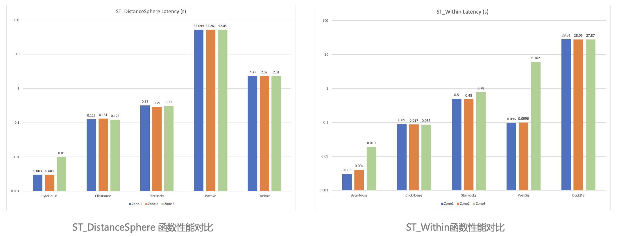 在 Benchmark 测试中,通过选取两个关键 GIS 函数ST_DistanceSphere 和 ST_Within,使用 NYC Taxi 数据集(Size:21GB;条数:169,001,162),并选取 3 个不同大小的地理区域,研发人员将 ByteHouse、StarRocks、 ClickHouse Community、PostGIS 、 DuckDB Spatial 进行性能对比。测试结果显示,ByteHouse 在优化器、硬件等层面的优化,使其在测试函数的性能上显著超越其他产品。
