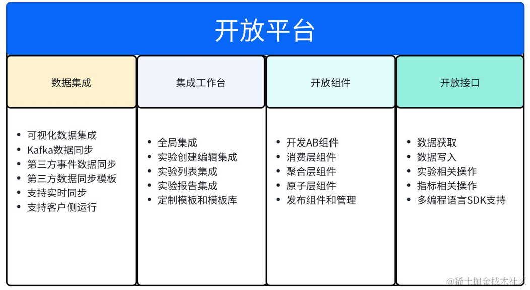 此外,开放平台中的开放组件是将 DataTester 中的模块以组件的形式拆分抽象的产物,用户也可以通过这些开放组件搭建自己特有的 A/B 测试平台应用。