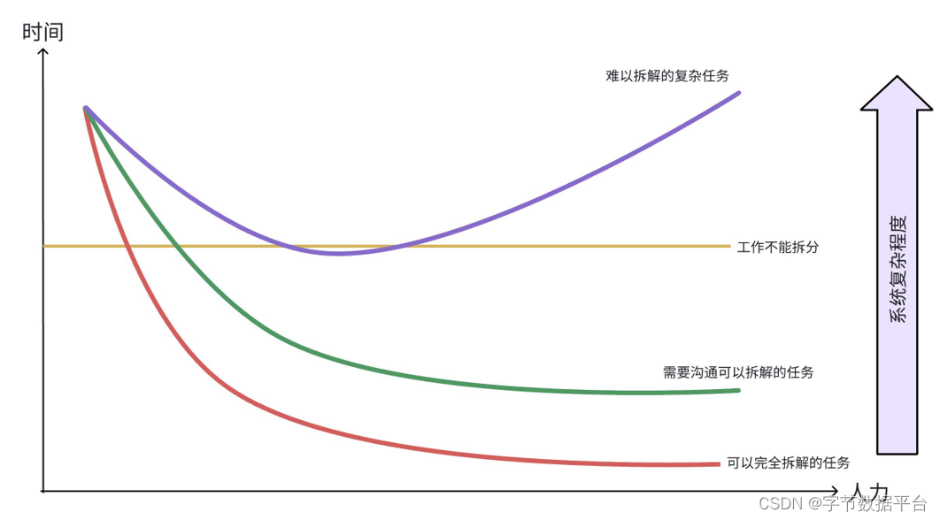 随着混乱的增加,团队生产力也持续下降,趋向于零。当生产力下降时,管理层就只有一件事可做了:增加更多人手到项目中,期望提升生产力。对于可以拆解的任务,增加人力确实可以缩短交付时间提升效率。但对于复杂的系统,新人并不熟悉系统的设计,他们搞不清楚什么样的修改符合设计意图,什么样的修改违背设计意图。而且,他们以及团队中的其他人都背负着提升生产力的可怕压力。于是,他们会制造更多的混乱,驱动生产力向零那端不断下降。因此,可以说补充人力在一定条件下是可以提升整体的进度与效率,但这并不绝对,特别是对于混乱的系统。