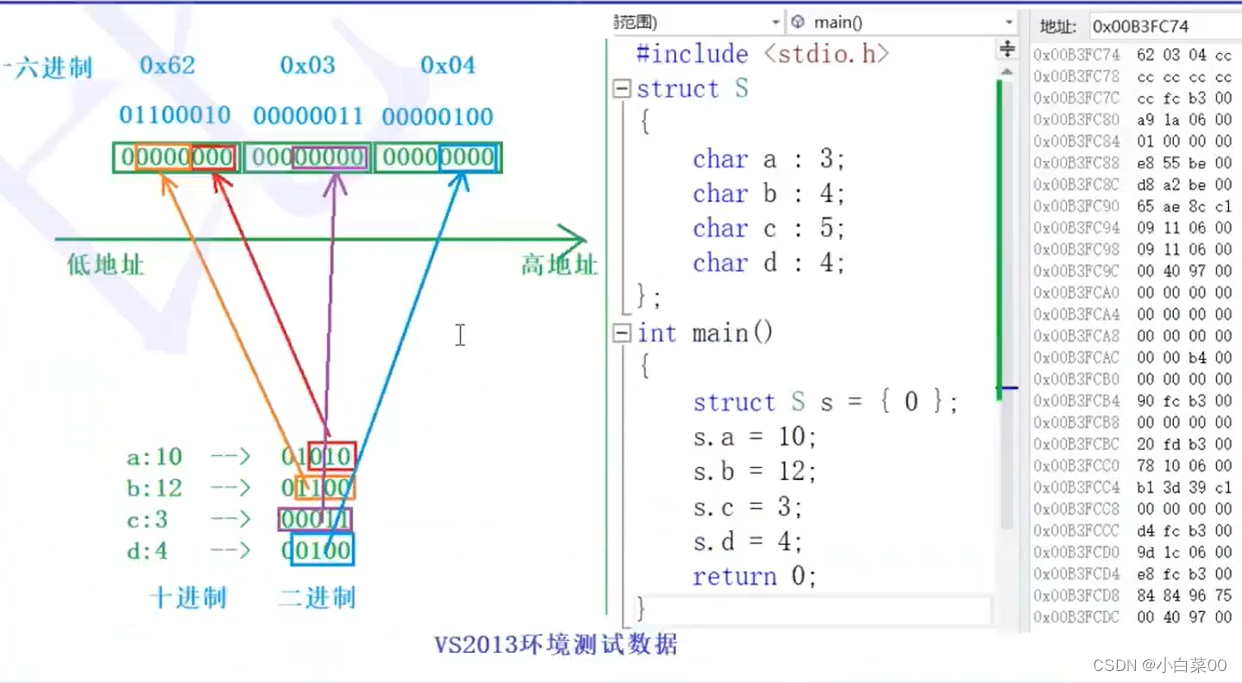 在VS编译器下一个字节内部的数据,先使用低比特位的地址,再使用高比特位的地址(在内存中分配从右往左使用)